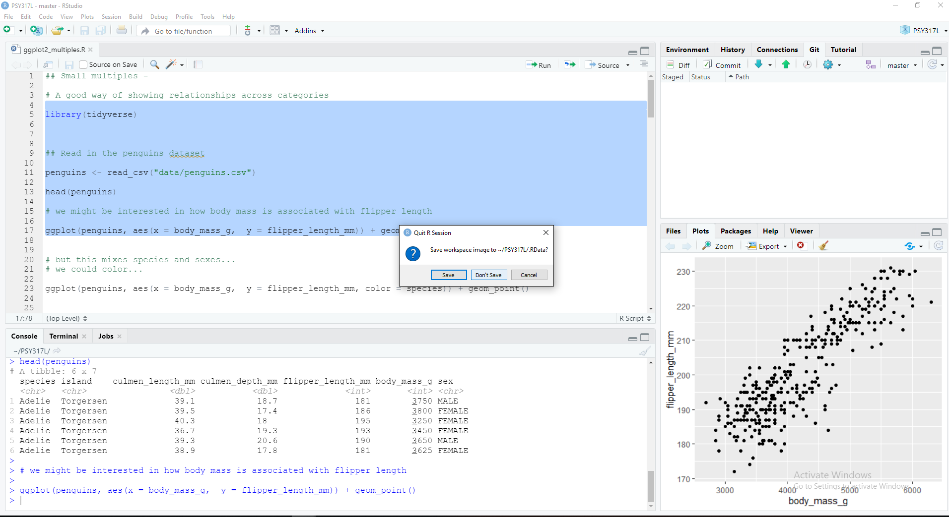 It asks you Save workspace image to ~/PSY317L/.RData?. You can safely hit Don't Save for this to just quit RStudio.