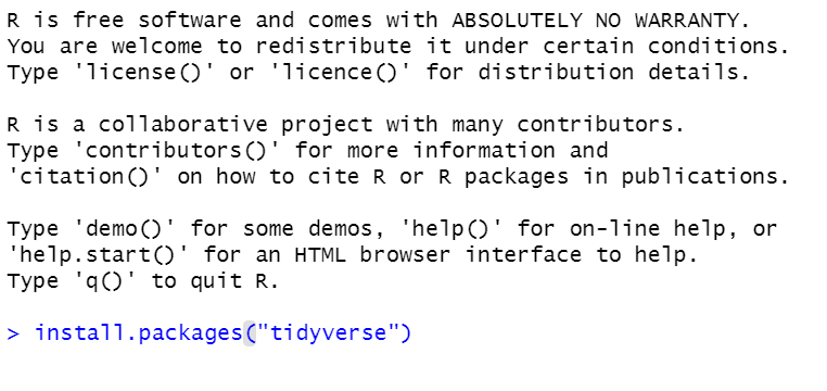 To test whether the main package that we will use tidyverse is downloaded correctly, then type the following in the console after the blue >