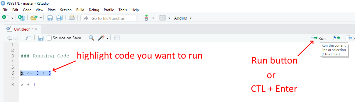 There are a few things to point out here. First, notice that the gray numbers now go to 11. This means we have 11 lines in the script. Some lines start with a # sign. These lines contain text (in green in our version) that is not code. After you put a # you can write notes to yourself or to others and R will ignore them - it will not run them as code. Anything else that is written, e.g. the x <- 3 + 5 and the x + 1 is in black or blue text and can be run as code.