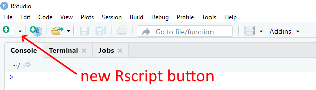 - Click on the button in the toolbar in RStudio that looks like a white sheet with a green plus sign. This is located right under