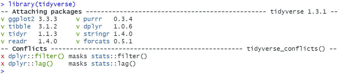 library(tidyverse)You should see something like the following appear - the red X under “Conflicts” are ok in this instance (they are just saying that the functions filter() and lag() are used by more than one package: