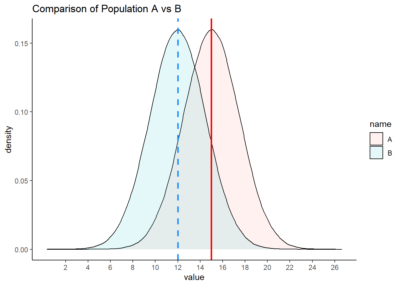 Say we have two normally distributed populations, A and B and each has 500,000 subjects. A has a population mean \(\mu = 15\), and a population standard deviation \(\sigma = 2.5\). B has a population mean \(\mu = 12\), and a population SD \(\sigma = 2.5\).