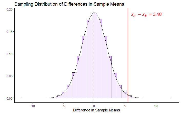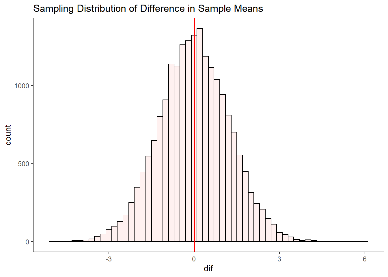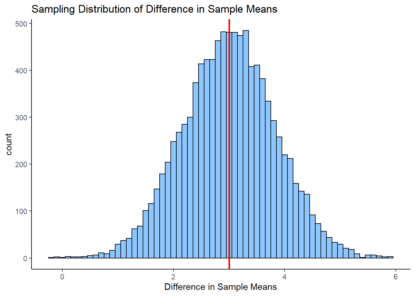 As you can see, the sampling distribution is approximately symmetrical. If we ran it for more simulations, it would become even more symmetrical. The average (mean) difference in sample means across all samples is \(\Large \mu_{\overline{x}_{A} - \overline{x}_{B}}= 2.987\) which is approximately equal to the real difference in population means \(\mu_{A} - \mu_{B}\).