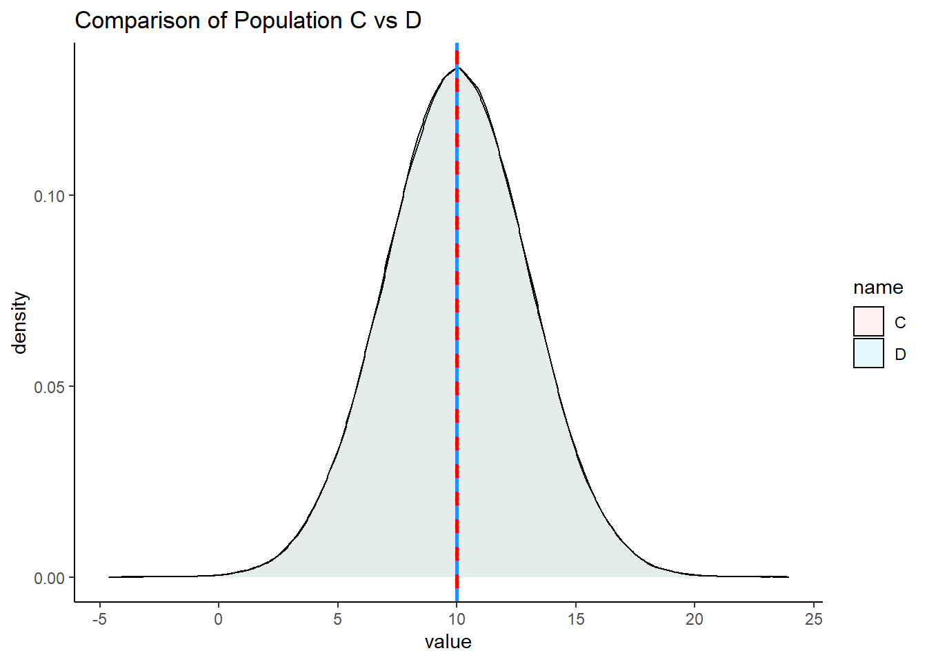 In this scenario, we have two normally distributed populations, C and D and each has 500,000 subjects. C has a population mean \(\mu = 10\), and a population standard deviation \(\sigma = 3\). D has a population mean \(\mu = 10\), and a population SD \(\sigma = 3\). We can generate these populations in R:
