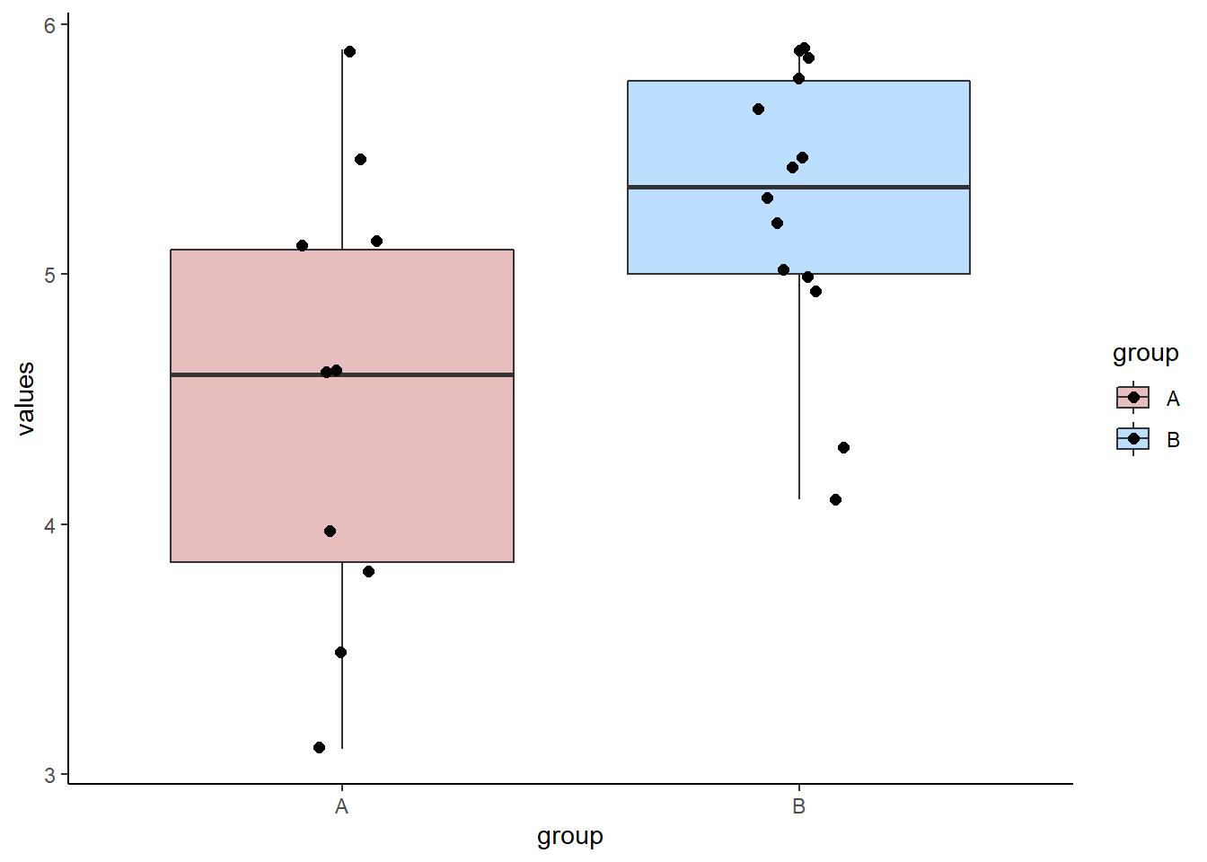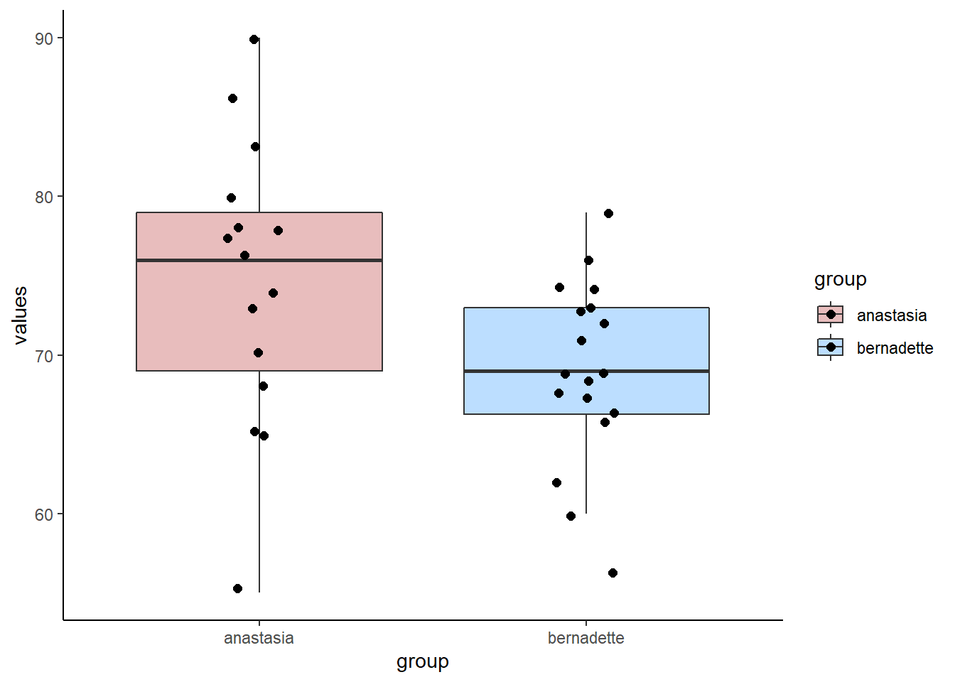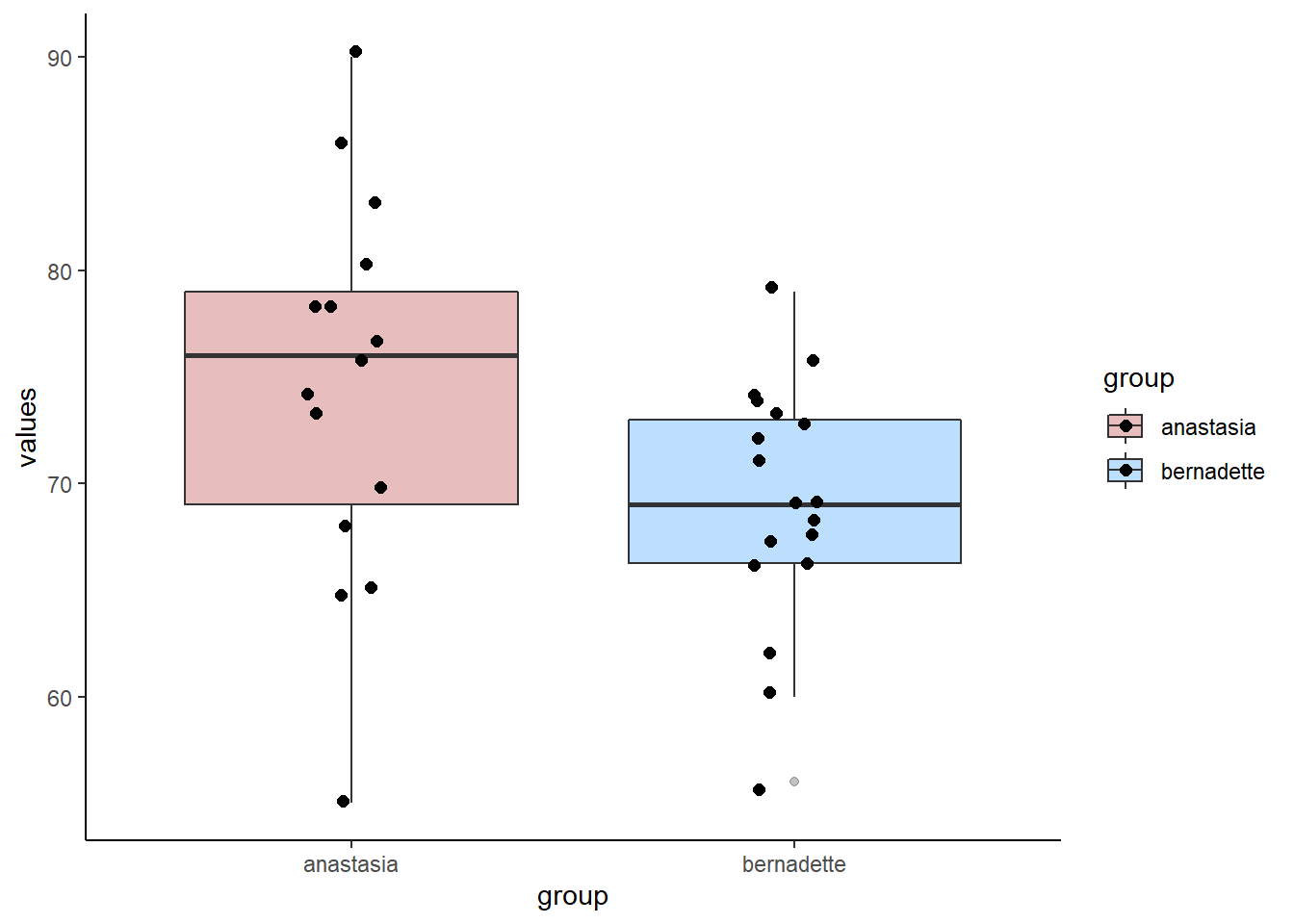 The default is to run a 2-tailed test. You are given a test-statistic \(W\) and a p-value. Here, \(p=0.0191\) which indicates that our two samples have significantly different medians. With this test, you will get a warning about not being able to compute an exact p-value with ties. This isn’t really important and can be ignored. In fact, you can turn it off by using the following: