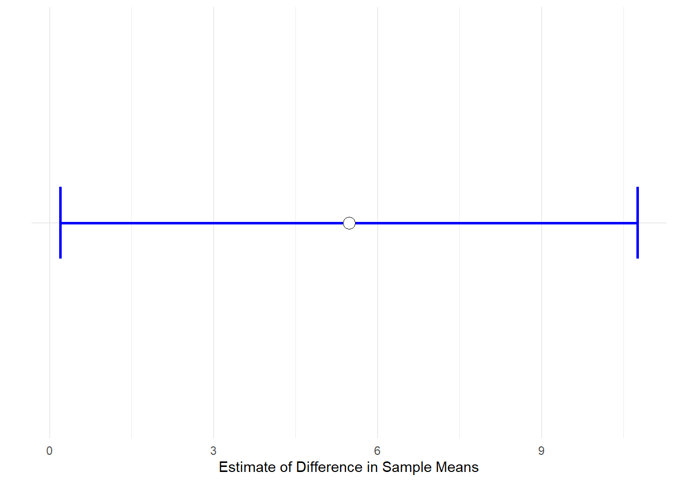 For a two-sample independent \(t\)-test, the sampling distribution we use is different to the sampling distribution for a one-sample \(t\)-test. In a one-sample test, we are focused on the sampling distribution of sample means. In a two-sample test we are focused on the sampling distribution of the differences in sample means.