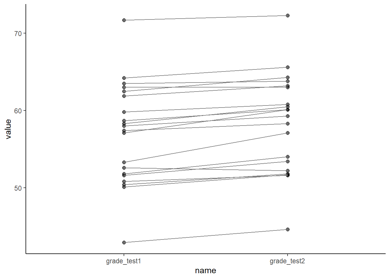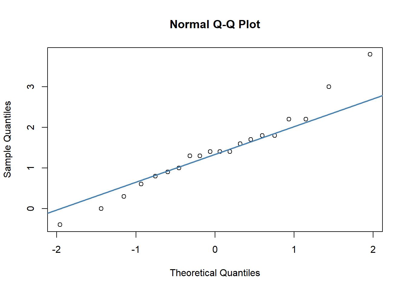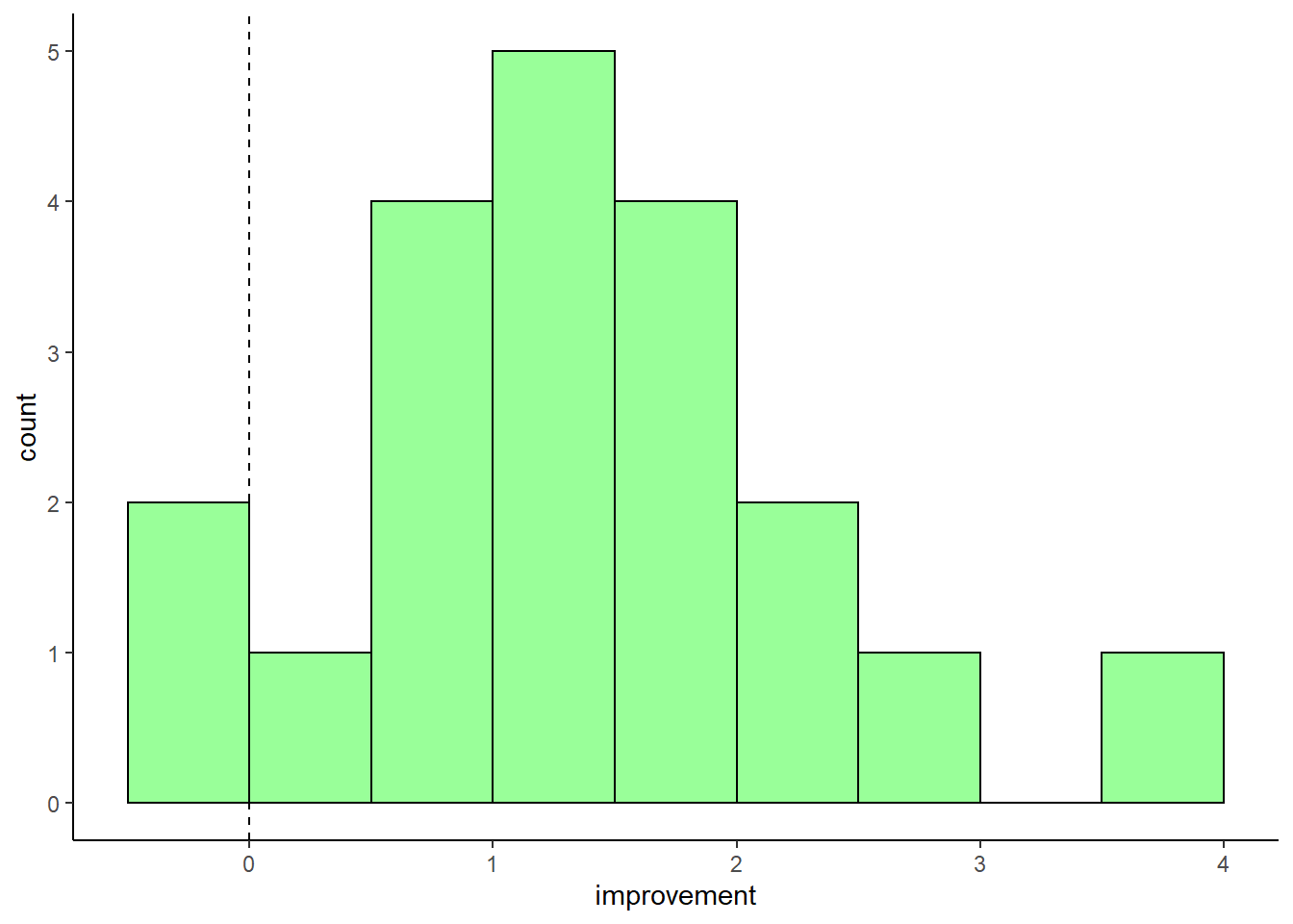 This gives us confidence intervals of the population median in differences cores of -0.135[-1.162, 0.137] which includes 0 and therefore suggests that there is no difference in medians between the paired groups. The p-value confirms this being \(p=0.54\). The \(V\) value is the test-statistic.