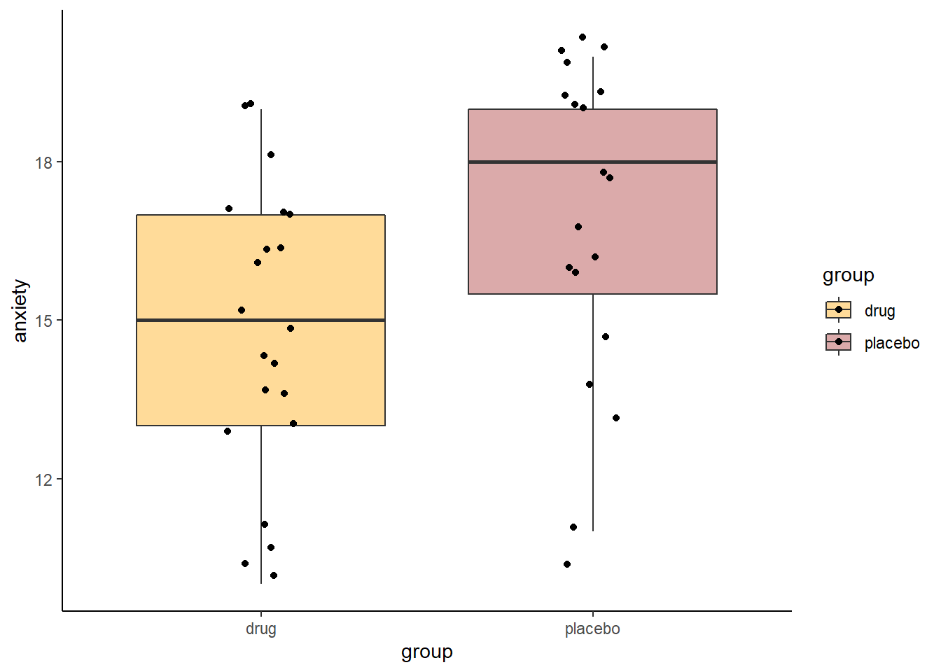 Looking at these data, it seems that the anti-anxiety drug group does have subjects with generally lower overall anxiety scores than the placebo group. A logical next step would be to think about doing an independent t-test.