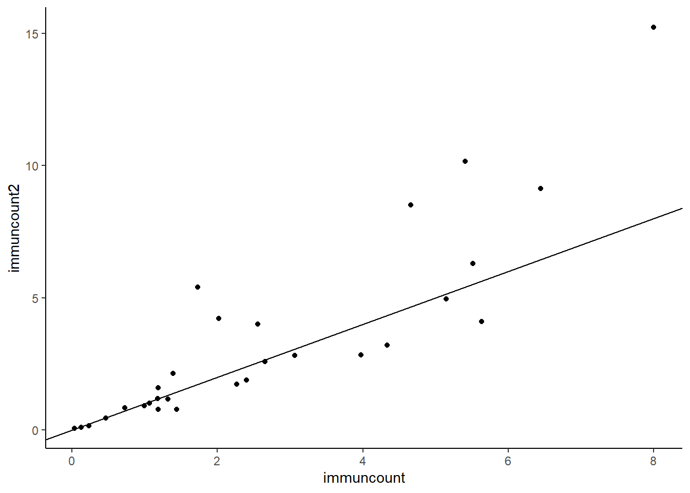 ggplot(df1, aes(x = immuncount, y=immuncount2 )) +