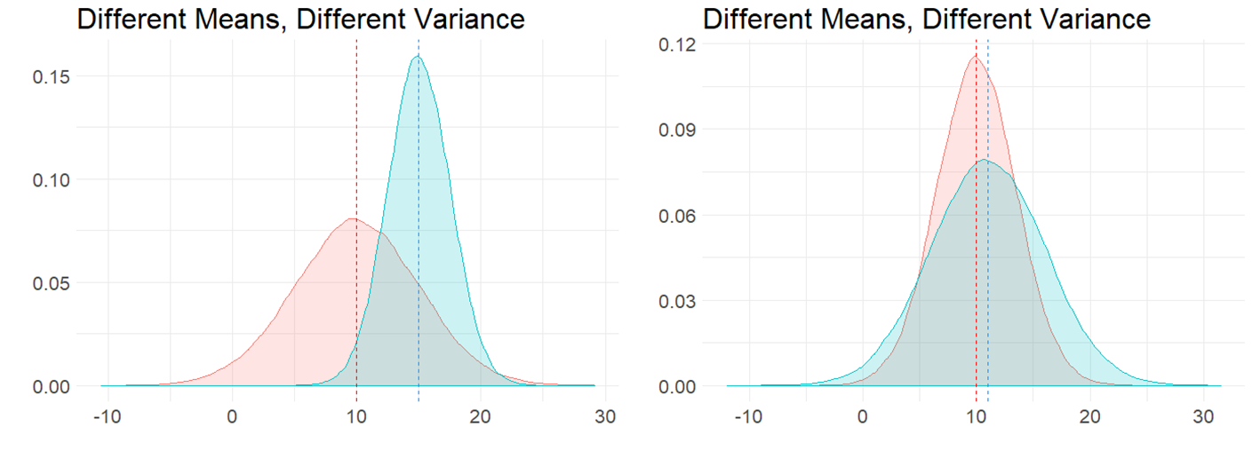 The bottom two distributions show populations with different population means \(\mu\) and the same variance \(\sigma^2\). In the bottom left, the means are quite far apart, whereas in the bottom right the means are different to each other but the effect is much smaller.