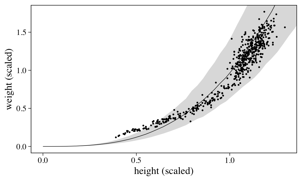 Suppose for example that a person is shaped like a cylinder. Of course a person isn’t exactly shaped like a cylinder. There are arms and a head. But let’s see how far this cylinder model gets us. The weight of the cylinder is a consequence of the volume of the cylinder. And the volume of the cylinder is a consequence of growth in the height and width of the cylinder. So if we can relate the height to the volume, then we’d have a model to predict weight from height. (p. 526, emphasis in the original)