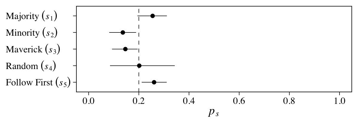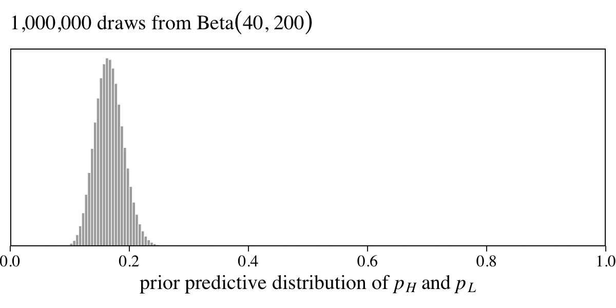 Here the points are the posterior medians and the horizontal lines the quantile-based 50% intervals. Turns out that \(\operatorname{Beta}(2, 18)\) prior for \(p\) pushes the bulk of the prior mass down near zero. The beta distribution also forces the parameter space for \(p\) to range between 0 and 1. If we denote the two parameters of the beta distribution as \(\alpha\) and \(\beta\), we can compute the mean for any beta distribution as \(\alpha / (\alpha + \beta)\). Thus the mean for our \(\operatorname{Beta}(2, 18)\) prior is \(2 / (2 + 18) = 2 / 20 = 0.1\).