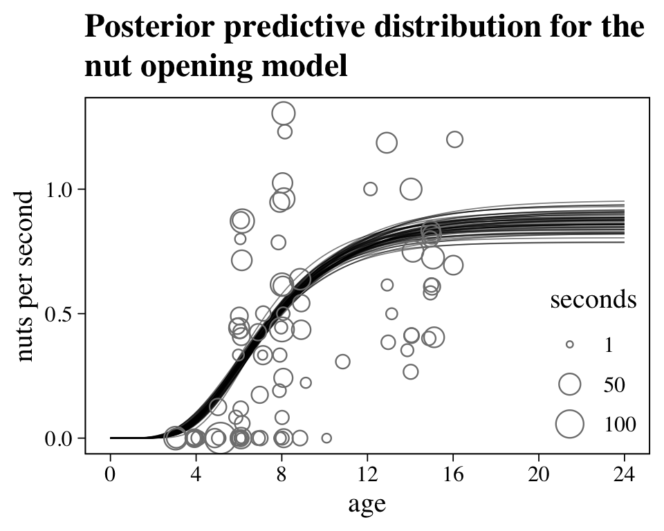 Here we’ll use fitted() to make a variant of the posterior predictions from the top portion of Figure 16.9.