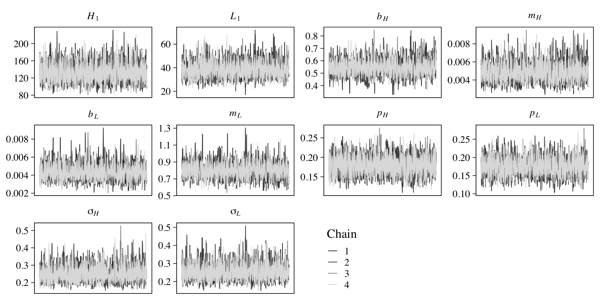 \[\begin{align*} L_t & \sim \operatorname{Log-Normal}(\log \mu_{L, t}, \sigma_L) \\ H_t & \sim \operatorname{Log-Normal}(\log \mu_{H, t}, \sigma_H) \\ \mu_{L, t} & = \alpha_L + \beta_{L1} L_{t - 1} + \beta_{L2} H_{t - 1} \\ \mu_{H, t} & = \alpha_H + \beta_{H1} H_{t - 1} + \beta_{H2} L_{t - 1}, \end{align*}\]