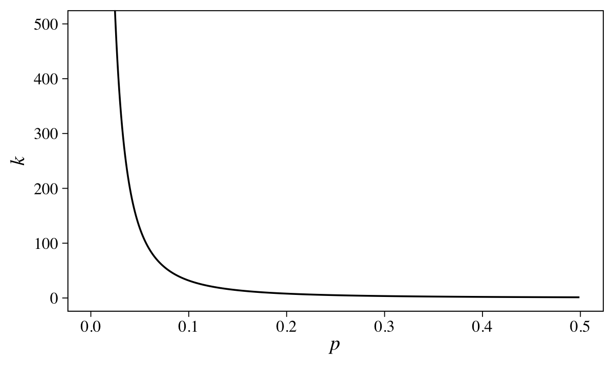 If you assume \(p < .5\), \(k\) must be greater than 1. \(k\) also has to be positive. To get a sense of this, we can further work the algebra: