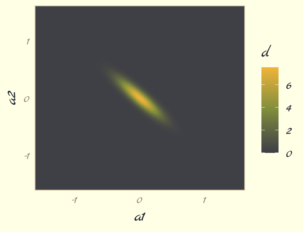 The first step is to simulate a bivariate distribution “with a strong negative correlation of -0.9” (p. 268). Henagen simulated the from a distribution where the two variables \(\text a_1\) and \(\text a_2\) followed the bivariate normal distribution