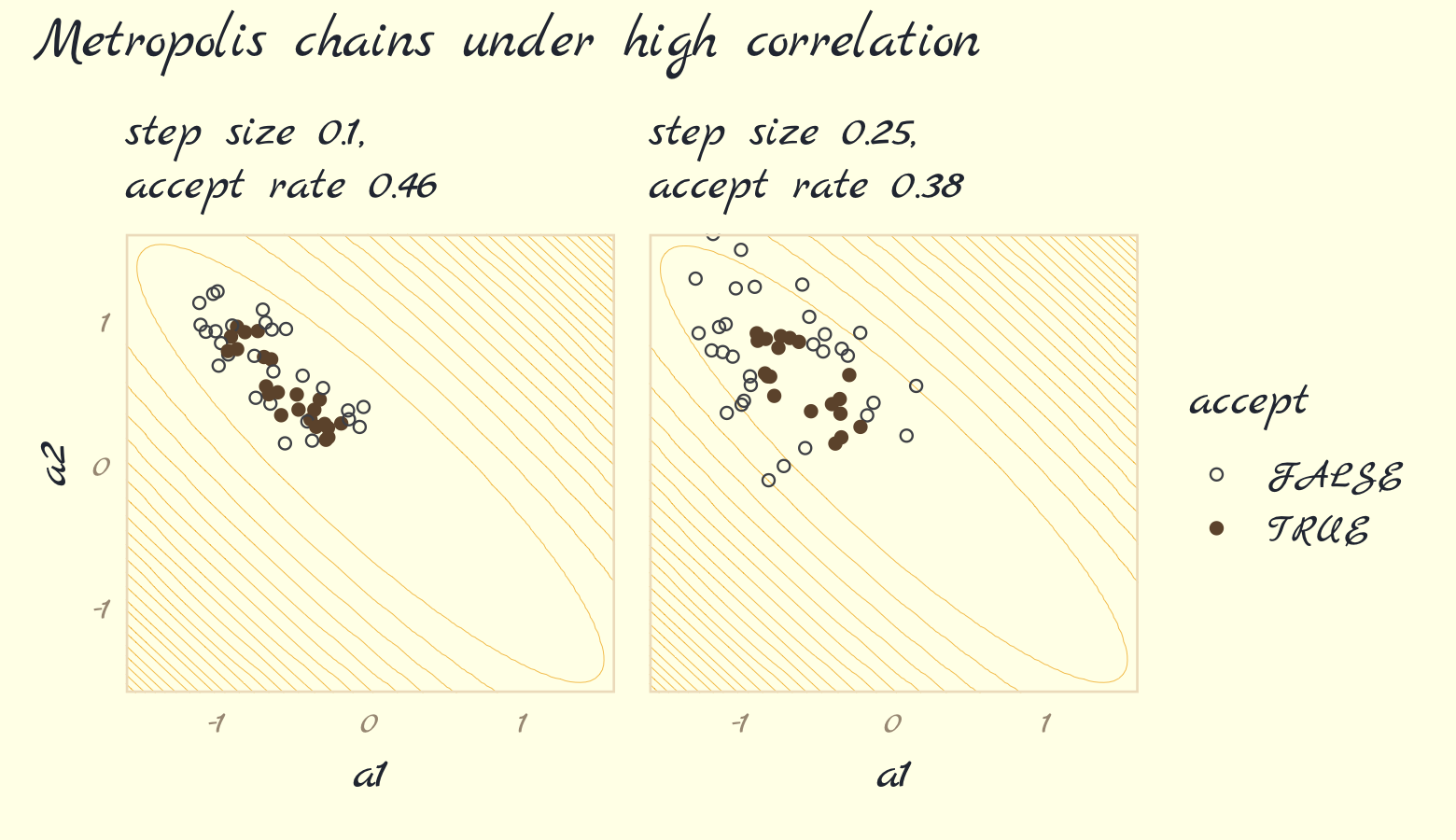 Earlier versions of this ebook did not focus on McElreath’s example of the pathology high autocorrelations can create when using the Metropolis algorithm, which is depicted in Figure 9.3. However, James Henegan kindly reached out with a tidyverse workflow for reproducing this example. Here is a slightly amended version of that workflow.