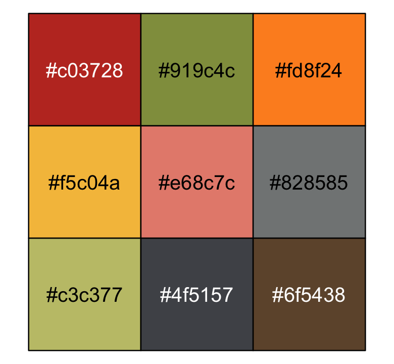 library(ggpomological)To get the full benefits from ggpomological, you may need to download some fonts. Throughout this chapter, I make extensive use of Marck Script, which you find at https://fonts.google.com/specimen/Marck+Script. Once you’ve installed the font on your computer, you may also have to execute extrafont::font_import(). Here we get a sense of the colors we’ll be using with our dots and lines and so on.