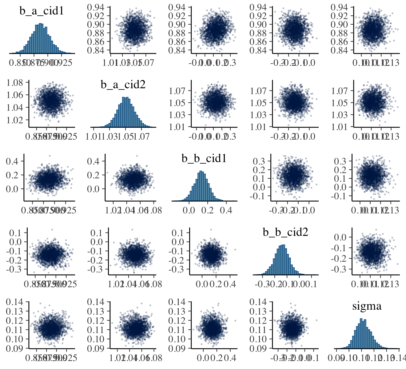 \[\begin{align*} \begin{bmatrix} \text a_1 \\ \text a_2 \end{bmatrix} & \sim \operatorname{MVNormal} \left (\begin{bmatrix} 0 \\ 0 \end{bmatrix}, \mathbf \Sigma \right) \\ \mathbf \Sigma & = \mathbf{SRS} \\ \mathbf S & = \begin{bmatrix} 0.22 & 0 \\ 0 & 0.22 \end{bmatrix} \\ \mathbf R & = \begin{bmatrix} 1 & -.9 \\ -.9 & 1 \end{bmatrix}, \end{align*}\]
