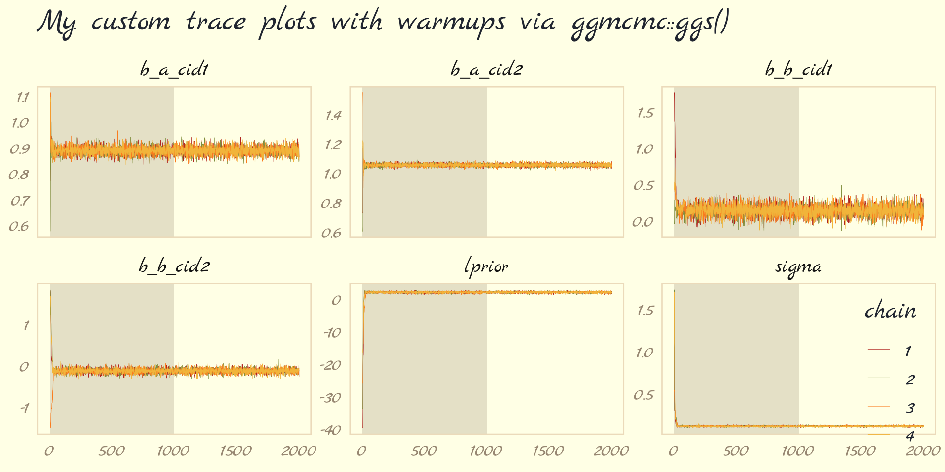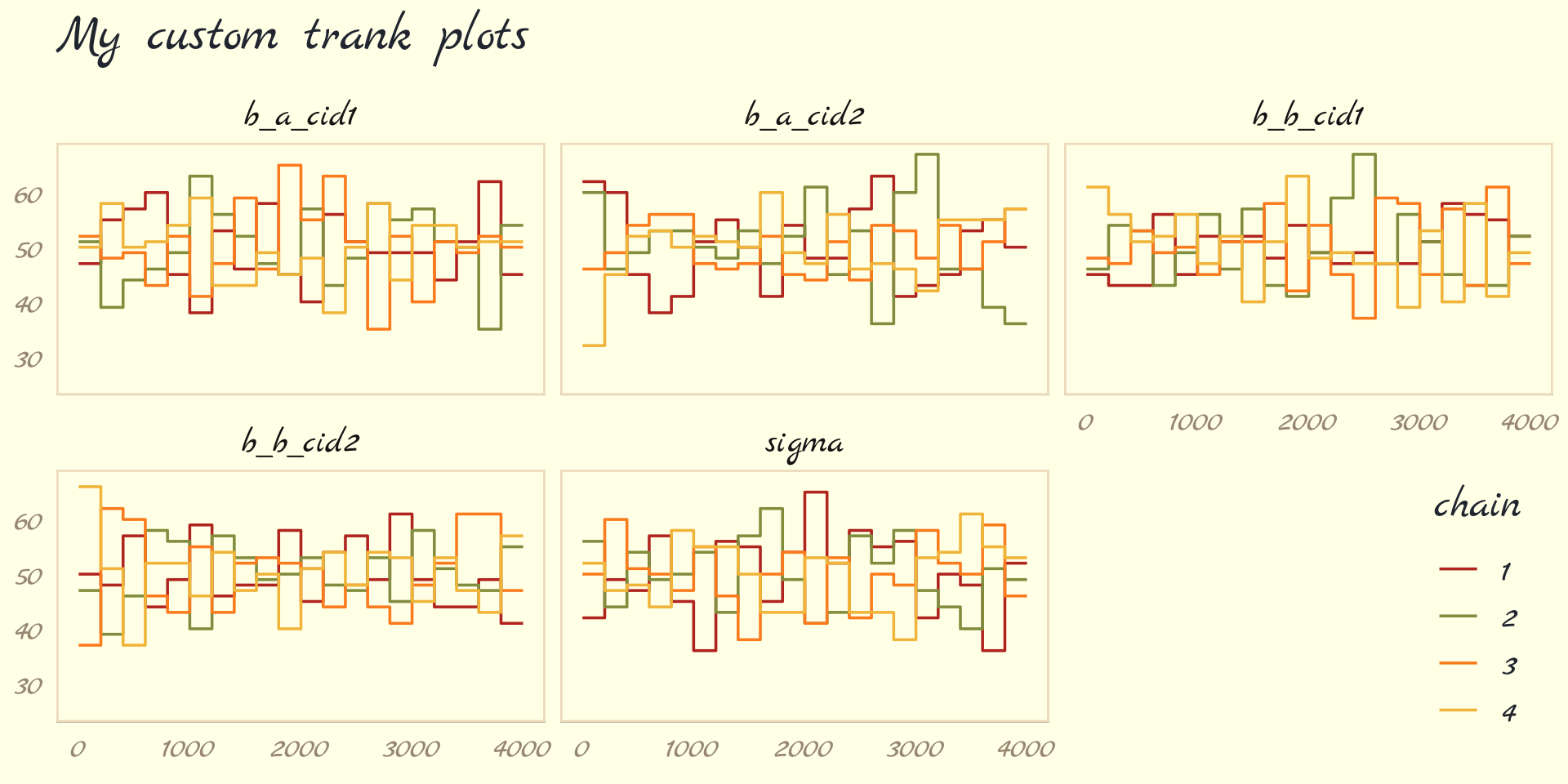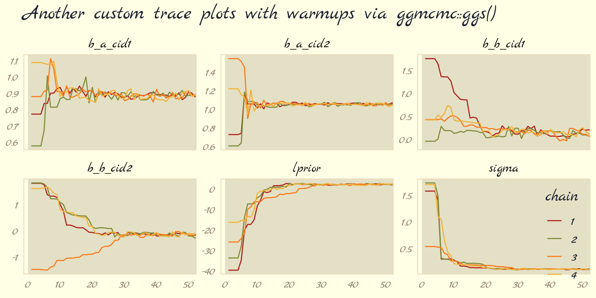 “The estimates for a1 and a2 are better identified now. Well, they still aren’t individually identified. But their sum is identified” (p. 296). Now it’s time to make our version of Figure 9.11. Before we do, one of the challenges we’ll have to overcome is the bayesplot::mcmc_rank_overlay() doesn’t seem to give users an easy way to control the faceting behavior of the plotting function. If you try to simultaneously plot all three model parameters with mcmc_rank_overlay(), you’ll end up with the one row and three columns. But I want the reverse. One solution is to make a custom plotting function. Since we’re juggling both mcmc_trace() and mcmc_rank_overlay(), we’ll make the function do both at once. The trick will be to set the function and workflow up so that we only enter in one parameter at a time. Here’s the function.