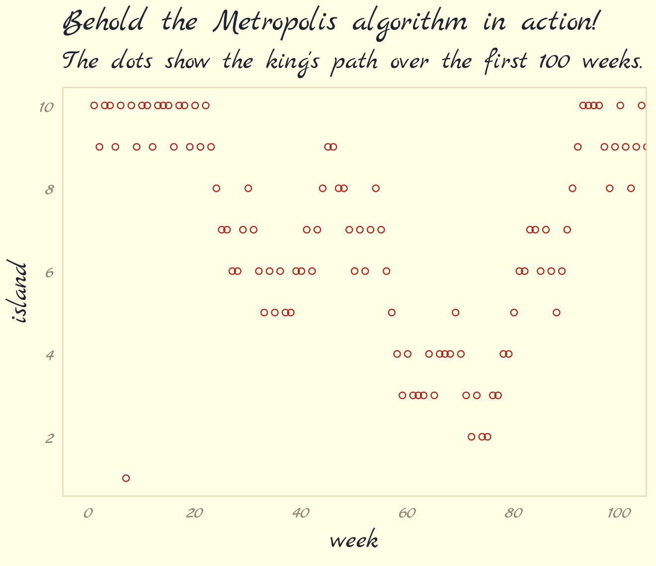 Here we simulate King Markov’s journey. In this version of the code, we’ve added set.seed(), which helps make the exact results reproducible.