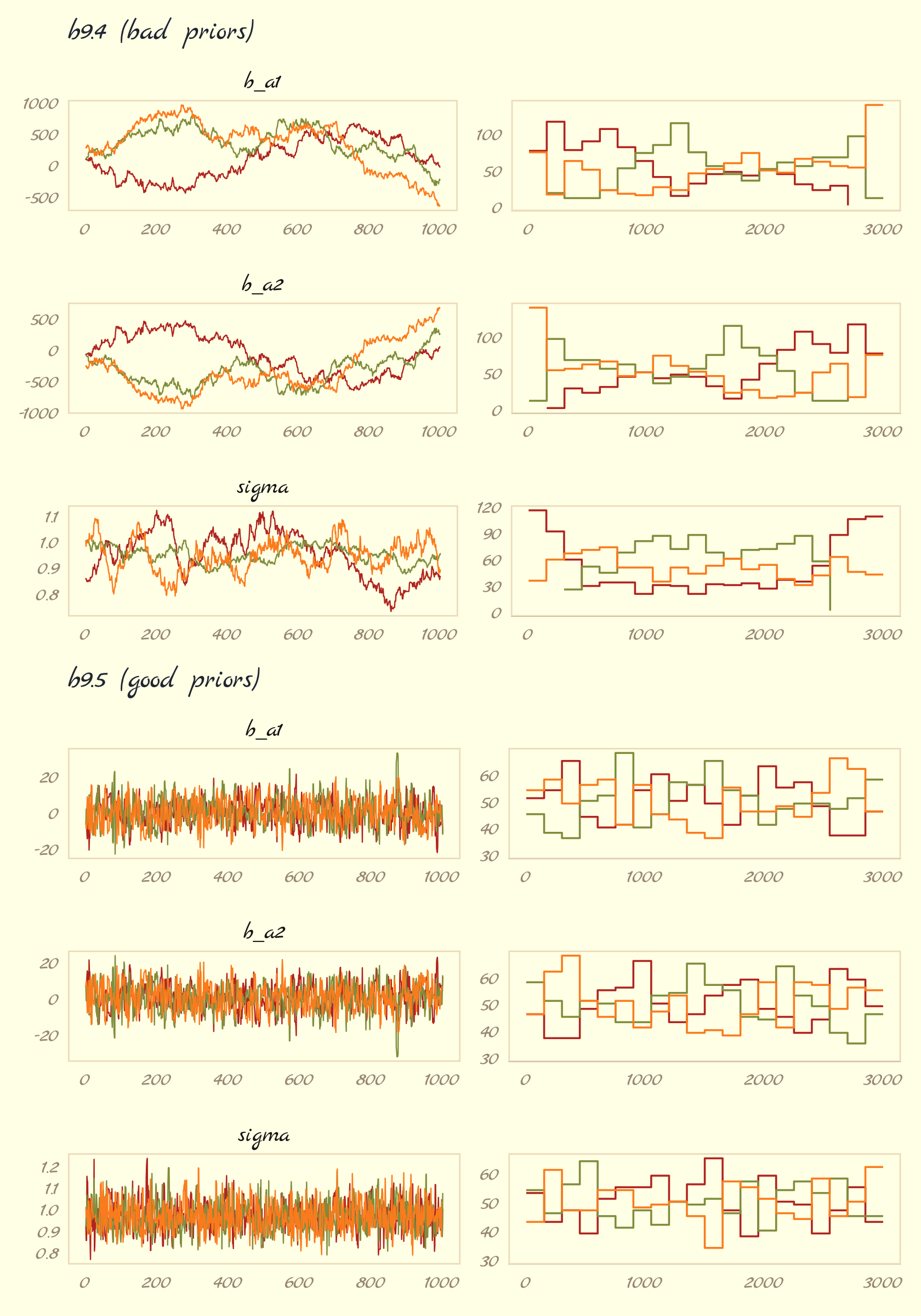 p1 <- trace_rank(data = post, var = "b_a1", subtitle = "b9.4 (bad priors)")