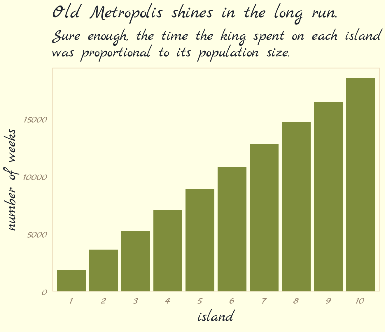 subtitle = "Sure enough, the time the king spent on each island\nwas proportional to its population size.") +