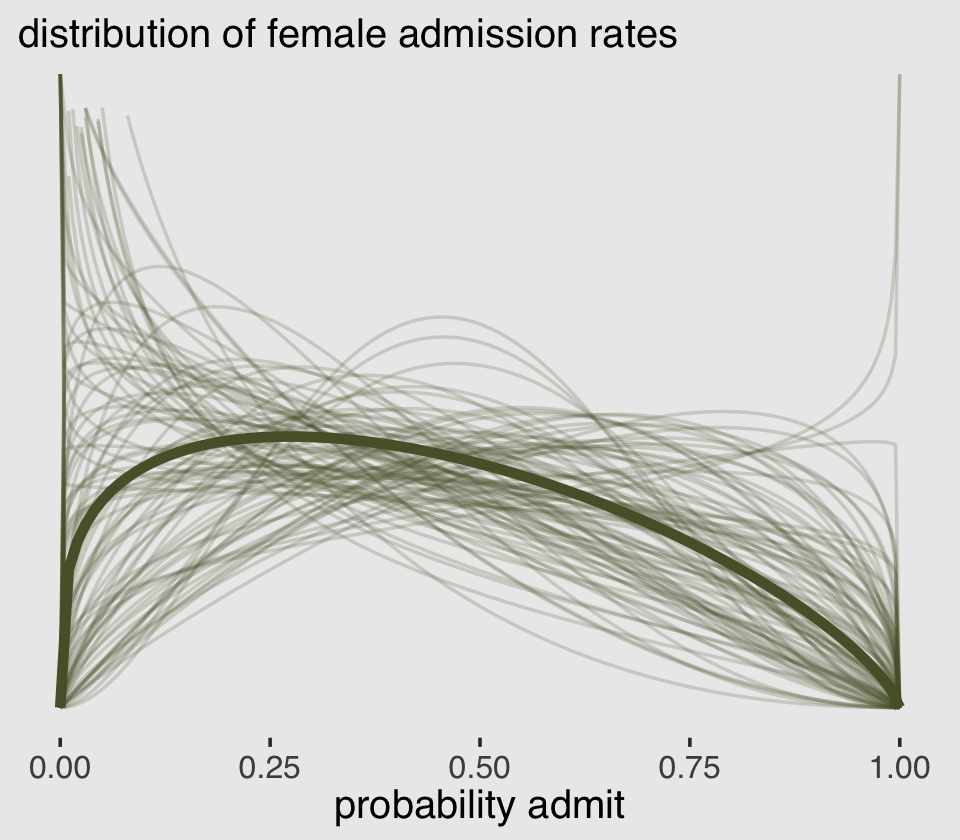 \[\begin{align*} \text{admit}_i & \sim \operatorname{BetaBinomial}(n_i, \bar p_i, \phi)\\ \operatorname{logit}(\bar p_i) & = \alpha_{\text{gid}[i]} \\ \alpha_j & \sim \operatorname{Normal}(0, 1.5) \\ \phi & \sim \operatorname{Exponential}(1). \end{align*}\]