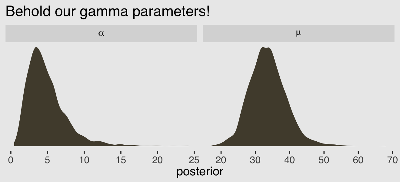 First, what McElreath referred to as the shape parameter, \(\theta\), Bürkner called the precision parameter, \(\phi\). In our exposition, above, we followed Kruschke’s convention and called it \(\kappa\). These are all the same thing: \(\theta\), \(\phi\), and \(\kappa\) are all the same thing. Perhaps less confusingly, what McElreath called the pbar parameter, \(\bar p\), Bürkner simply refers to as \(\mu\).
