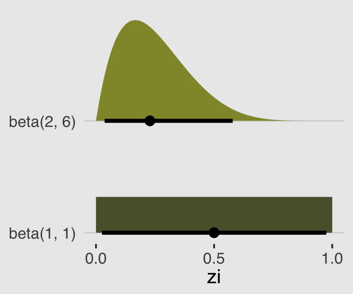 which you can verify in the Continuous distributions on [0, 1] section Stan functions reference (Stan Development Team, 2022a). In the formula, \(\text B\) stands for the Beta function, which computes a normalizing constant, which you can learn about in the Mathematical functions chapter of the Stan functions reference. If you look at the base R dbeta() function, you’ll learn it takes two parameters, shape1 and shape2. Those uncreatively-named parameters are the same \(\alpha\) and \(\beta\) from the density, above. They do not correspond to the pbar and theta parameters of McEreath’s rethinking::dbeta2() function.