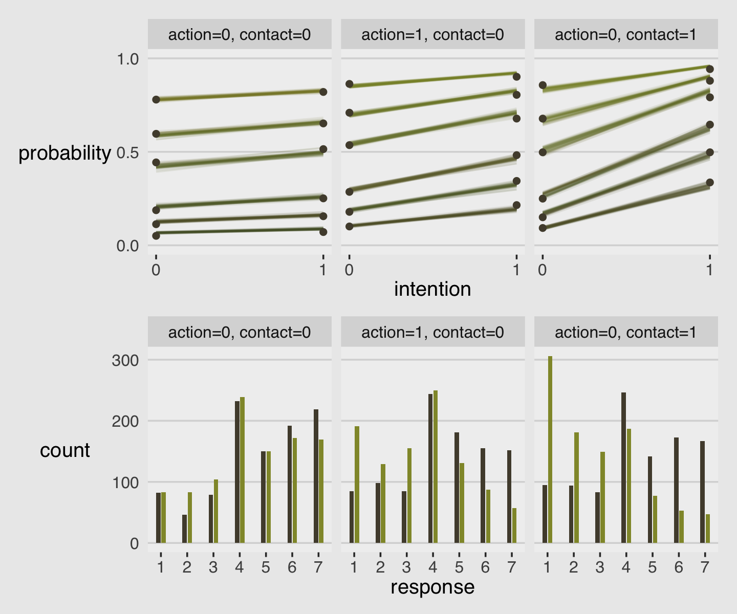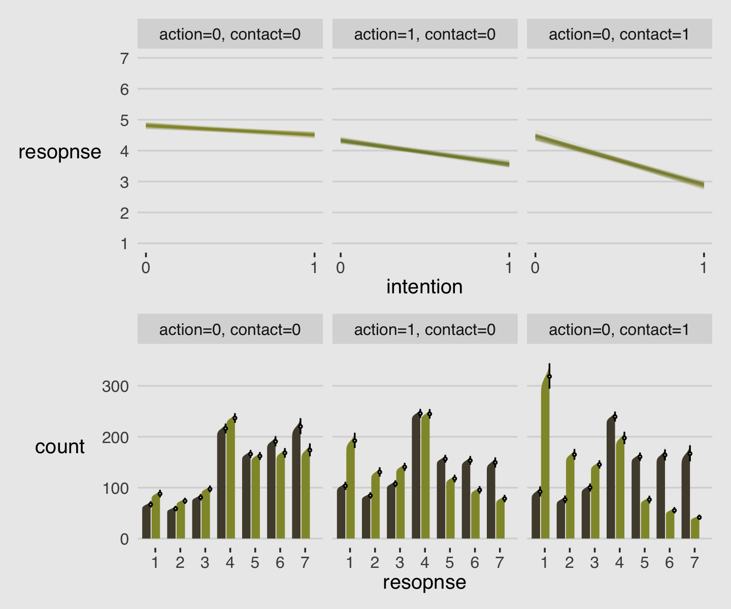 response = rep(1:7, each = 8))Now combine the two data objects and plot.