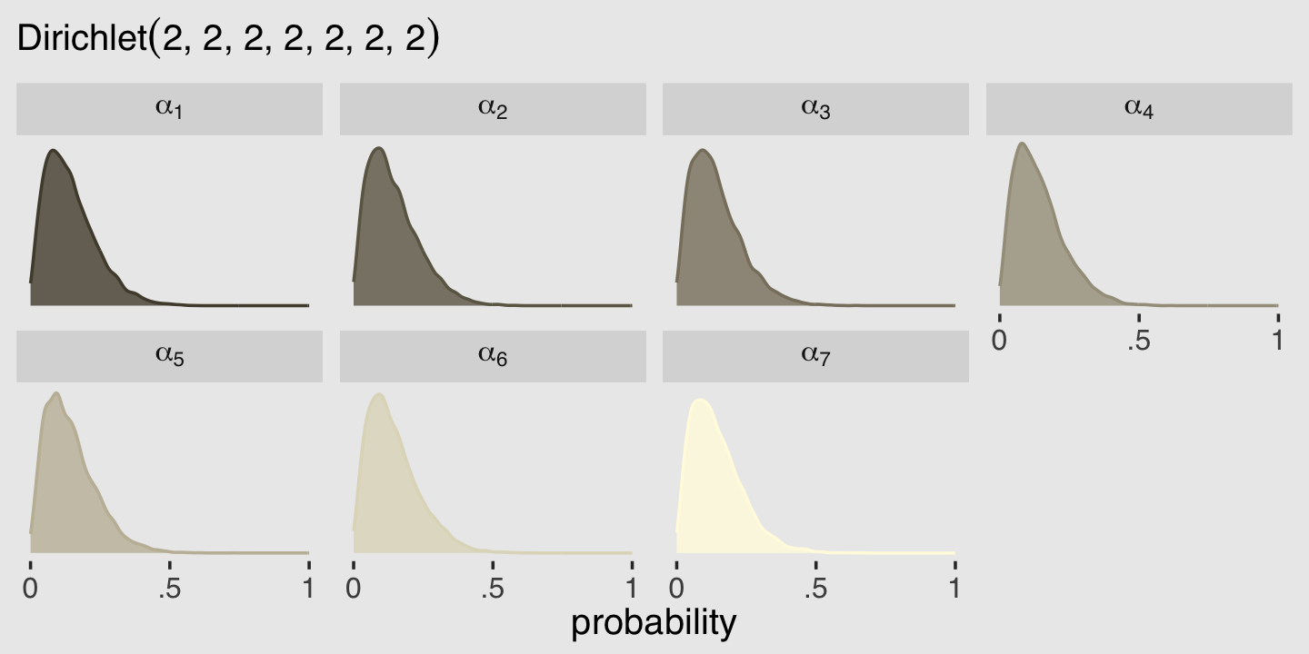 McElreath had good reason for using dbeta2(). Beta’s typical \(\alpha\) and \(\beta\) parameters aren’t the most intuitive to use; the parameters in McElreath’s dbeta2() are much nicer. If you dive a little deeper, it turns out you can find the mean of a beta distribution in terms of \(\alpha\) and \(\beta\) like this: