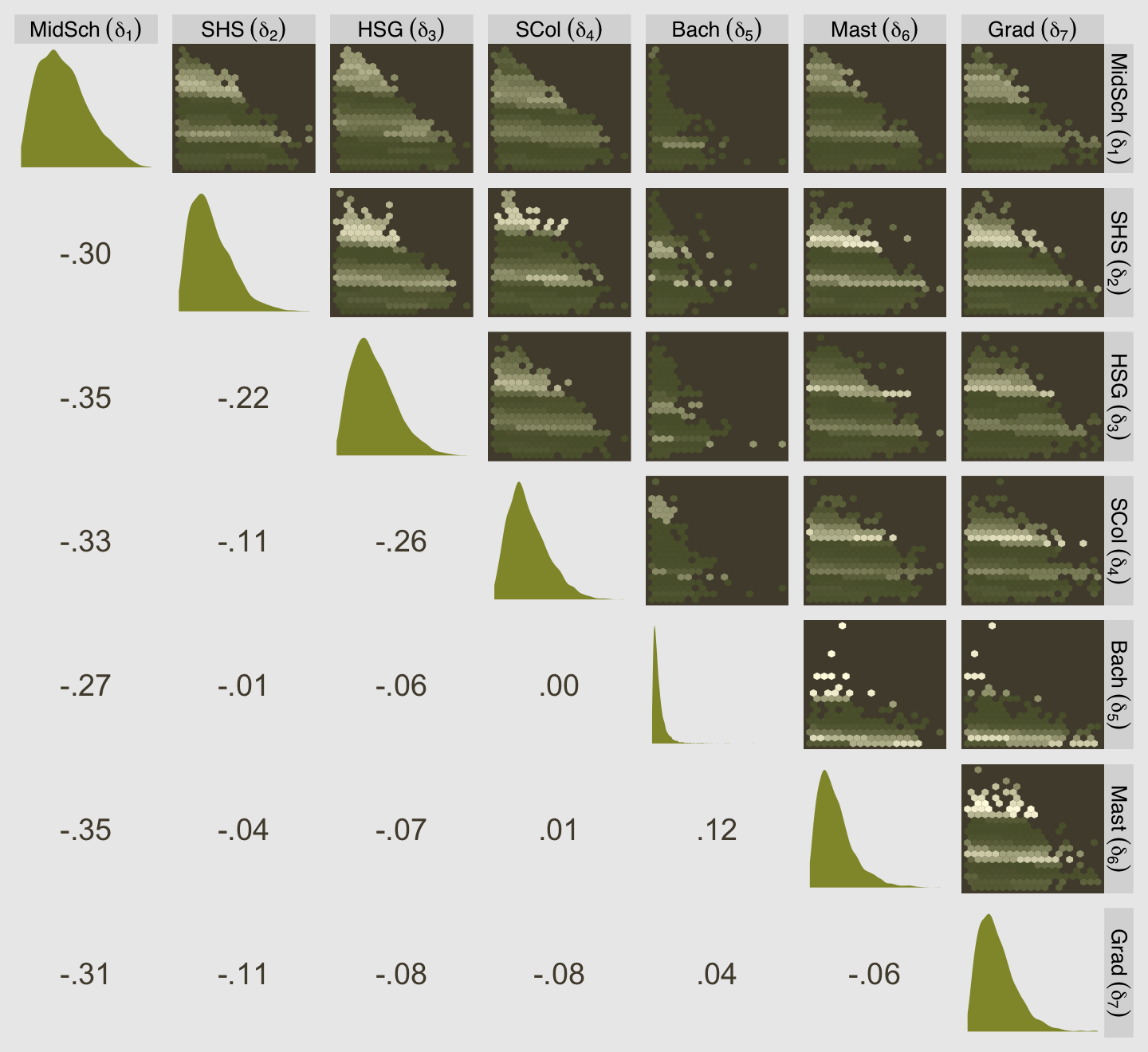 This is another way to show that the largest effects of education are when going from Elementary School to Middle School (\(\delta_0 \rightarrow \delta_1\)) and when going from Some High School to High School Graduate (\(\delta_2 \rightarrow \delta_3\)).