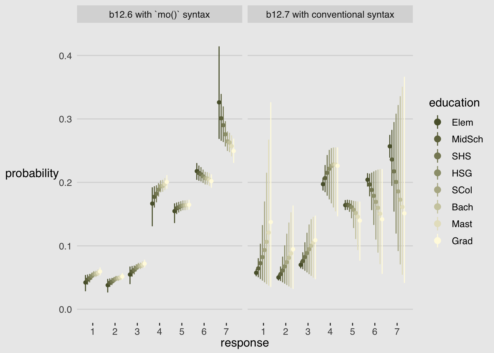 mutate(fit = rep(c("b12.6 with `mo()` syntax", "b12.7 with conventional syntax"),