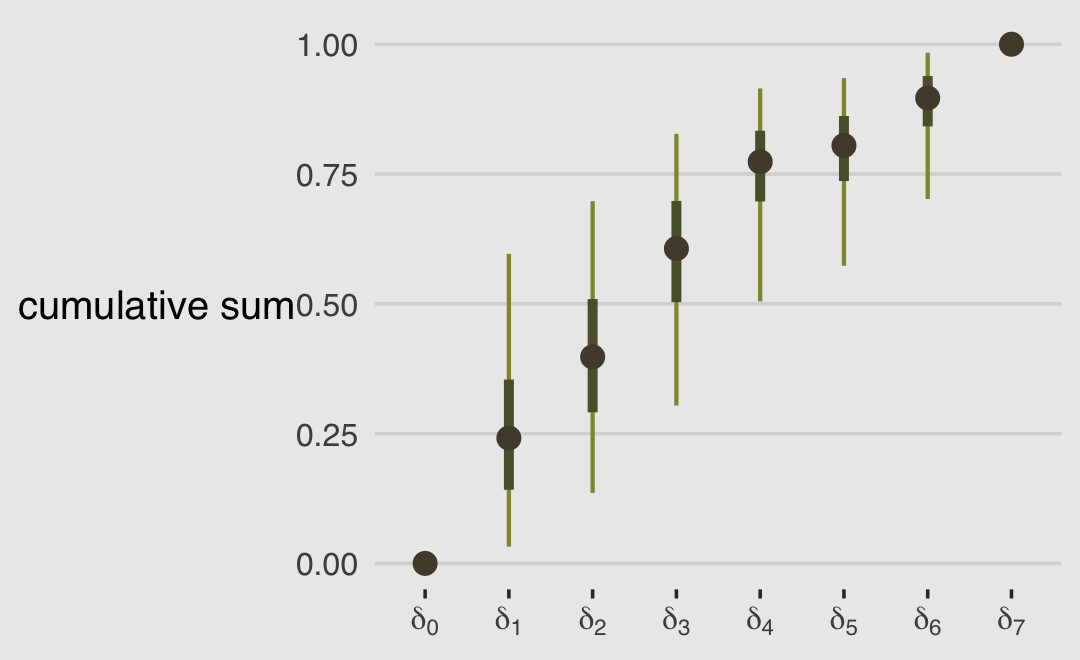 We might explore the monotonic effects of b12.6 in one more way. If you were reading closely along in the text, you may have noticed that “the sum of every \(\delta_j\) is 1” (p. 392). When using HMC, this is true for each posterior draw. We can exploit that information to visualize the \(\delta_j\) parameters in a cumulative fashion.