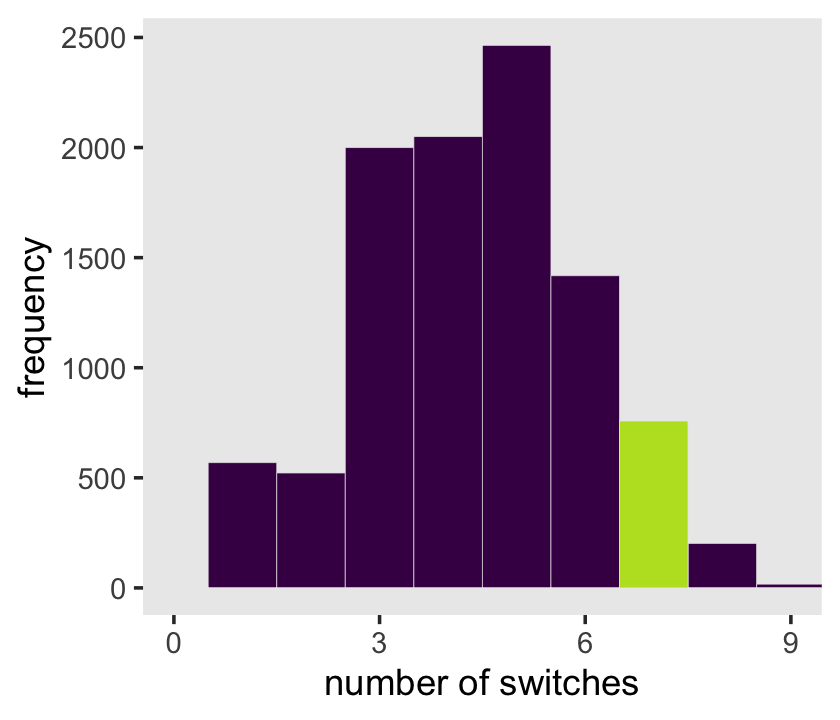 As you might imagine, we can use the output from fitted() to return disaggregated batches of 0’s and 1’s, too. And we could even use those disaggregated 0’s and 1’s to examine longest run lengths and numbers of switches as in the analyses for Figure 3.7. I’ll leave those as exercises for the interested reader.