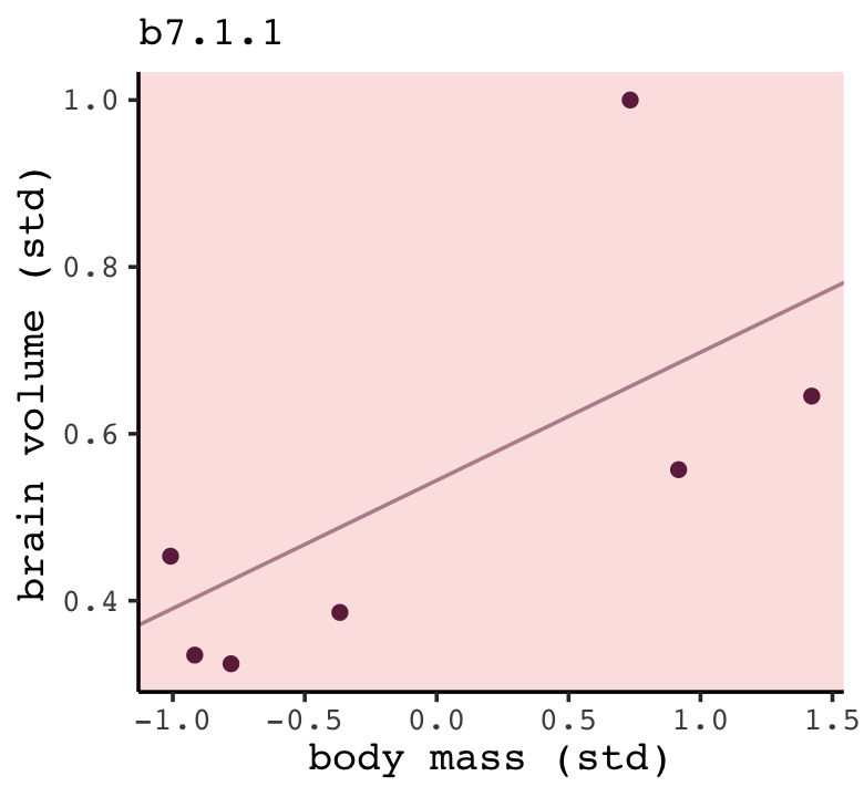 we want to standardize body mass–give it mean zero and standard deviation one–and rescale the outcome, brain volume, so that the largest observed value is 1. Why not standardize brain volume as well? Because we want to preserve zero as a reference point: No brain at all. You can’t have negative brain. I don’t think. (p. 195)