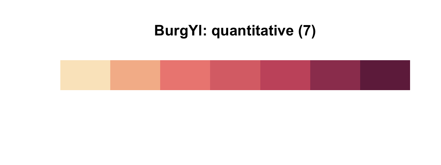 carto_pal(7, "BurgYl")## [1] "#fbe6c5" "#f5ba98" "#ee8a82" "#dc7176" "#c8586c" "#9c3f5d" "#70284a"