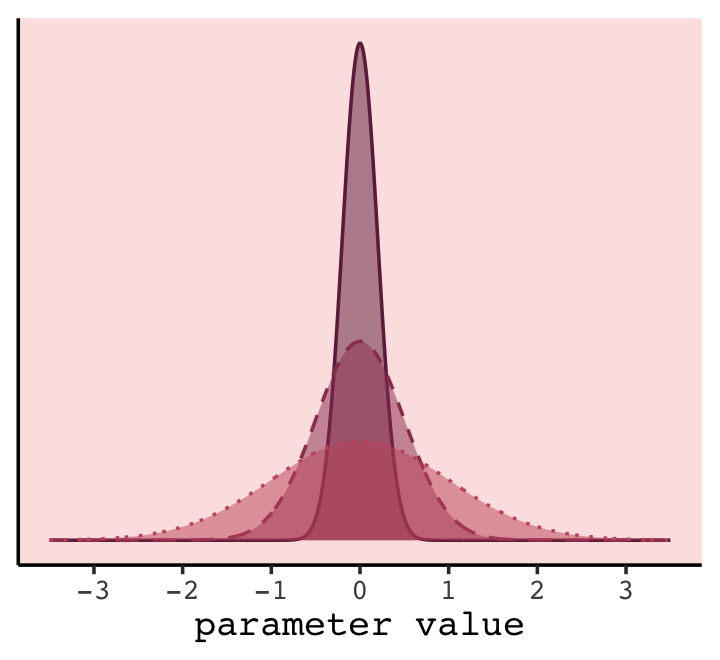 This simply says that the average brain volume \(b_i\) of species \(i\) is a linear function of its body mass \(m_i\). Now consider what the priors imply. The prior for \(\alpha\) is just centered on the mean brain volume (rescaled) in the data. So it says that the average species with an average body mass has a brain volume with an 89% credible interval from about −1 to 2. That is ridiculously wide and includes impossible (negative) values. The prior for \(\beta\) is very flat and centered on zero. It allows for absurdly large positive and negative relationships. These priors allow for absurd inferences, especially as the model gets more complex. And that’s part of the lesson. (p. 196)