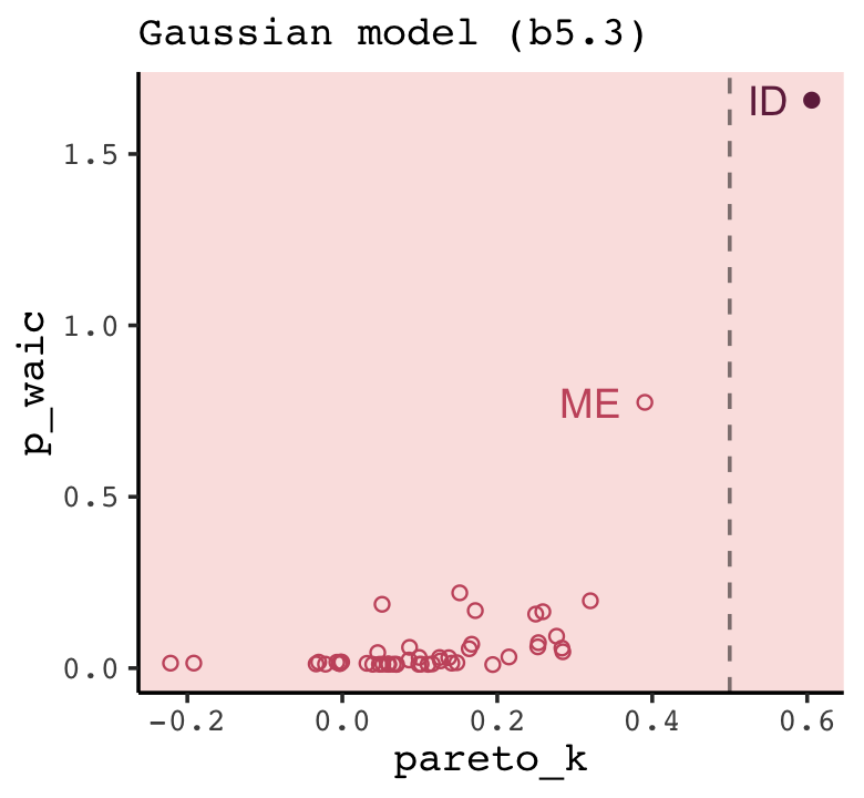 At the beginning of the chapter (pp. 193–201), McElreath introduced \(R^2\) as a popular way to assess the variance explained in a model. He pooh-poohed it because of its tendency to overfit. It’s also limited in that it doesn’t generalize well outside of the single-level Gaussian framework, which will be a big deal for us starting in Chapter 10. However, if you should find yourself in a situation where \(R^2\) suits your purposes, the brms bayes_R2() function might be of use. Simply feeding a model brm() fit object into bayes_R2() will return the posterior mean, \(\textit{SD}\), and 95% intervals. For example: