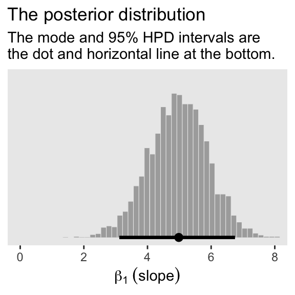 subtitle = "The mode and 95% HPD intervals are\nthe dot and horizontal line at the bottom.") +