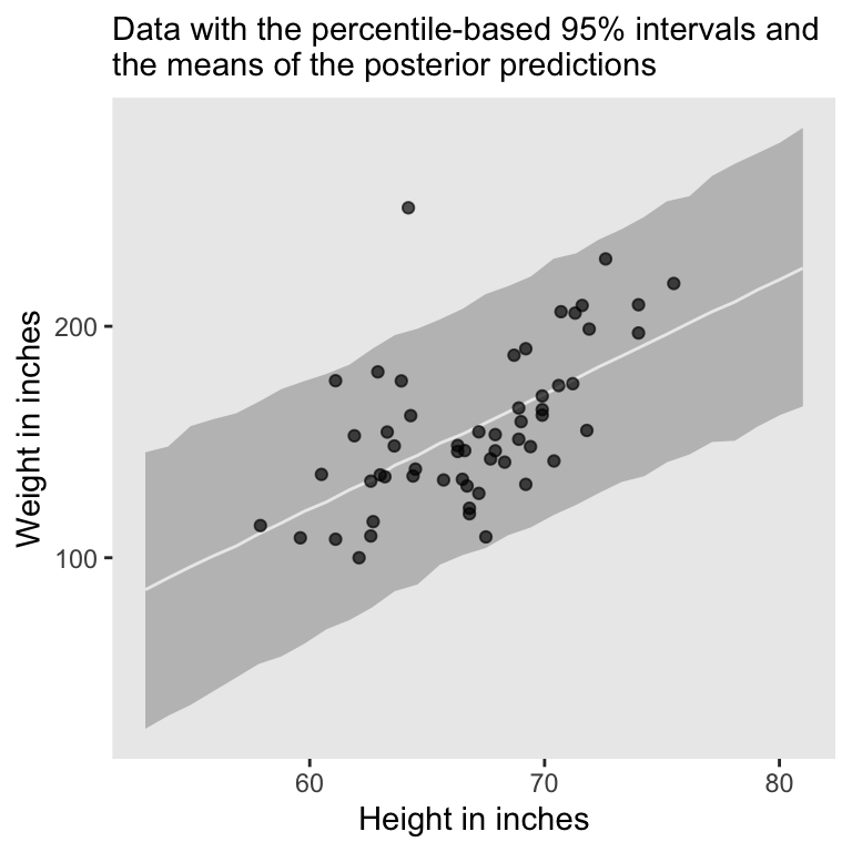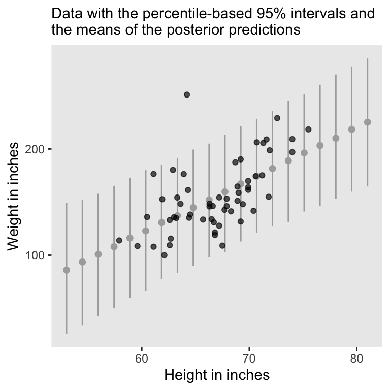 subtitle = "Data with the percentile-based 95% intervals and\nthe means of the posterior predictions") +