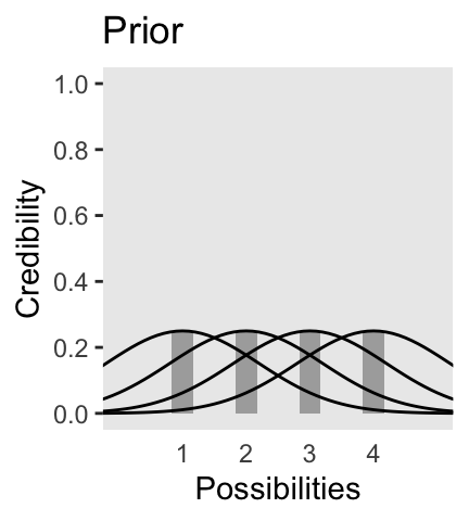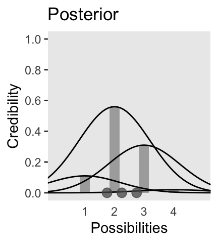 Now on to Figure 2.3. I’m pretty sure the curves in the plot are Gaussian, which we’ll make with the dnorm() function. After a little trial and error, their standard deviations look to be 1.2. However, it’s tricky placing those curves in along with the probabilities, because the probabilities for the four discrete sizes (i.e., 1 through 4) are in a different metric than the Gaussian density curves. Since the probability metric for the four discrete sizes are the primary metric of the plot, we need to rescale the curves using a little algebra, which we do in the data code below. After that, the code for the plot is relatively simple.