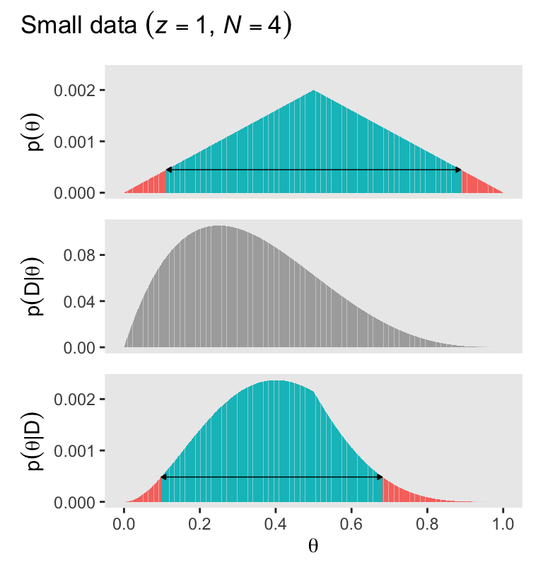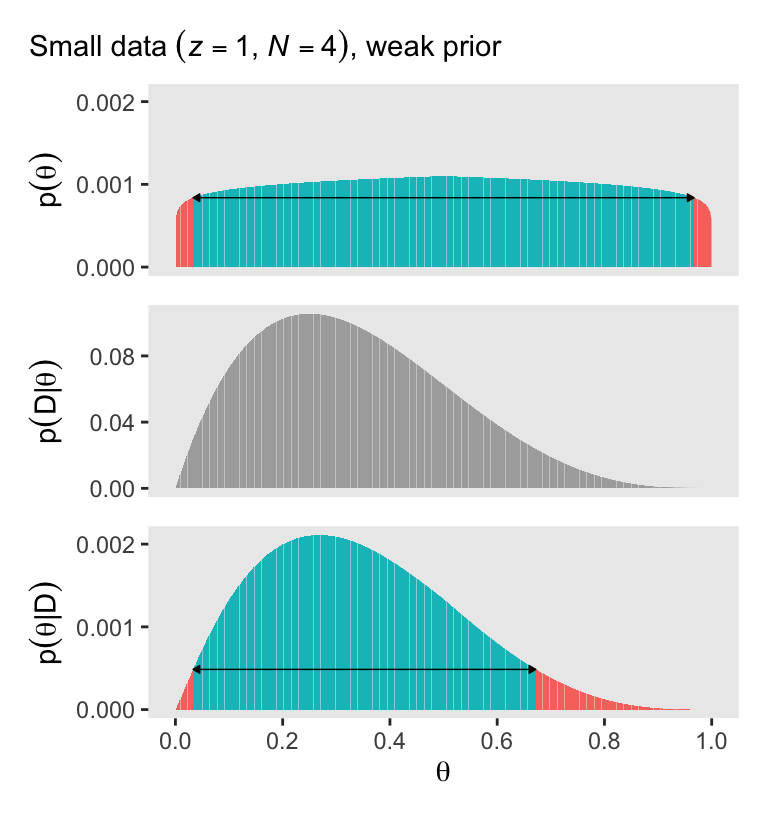 labs(subtitle = expression("Small data "*({italic(z)==1}*", "*italic(N)==4)*", weak prior")) +
