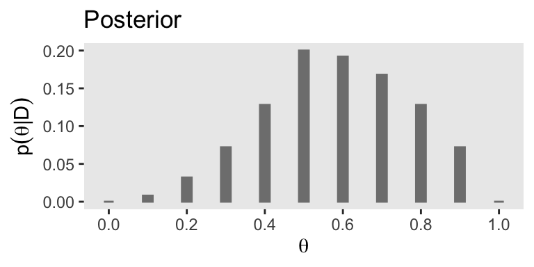 Also note how even though the density distributions appear approximately solid, they are actually all densely packed sequences of vertical lines via geom_col(). Kruschke described this as a “comb” of points in a data grid (p. 115). If you look through the code of his BernGrid() function which he described in his Section 5.5 Appendix, you’ll see the solid-looking shapes in his Figures 5.2 and 5.2 are also made from a densely-packed comb of vertical lines. In later chapters, we’ll use a different approach via functions like geom_area().