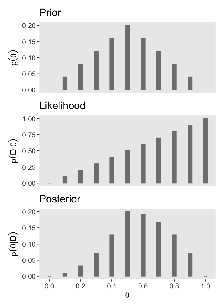 \[\begin{align*} p(\theta \mid D) & = \frac{p(D \mid \theta) \; p(\theta)}{p(D)} \;\; \text{and since} \\ p(D) & = \sum\limits_{\theta^*}p(D \mid \theta^*) \; p(\theta^*), \;\; \text{it's also the case that} \\ p(\theta \mid D) & = \frac{p(D \mid \theta) \; p(\theta)}{\sum\limits_{\theta^*}p(D \mid \theta^*) \; p(\theta^*)}. \end{align*}\]