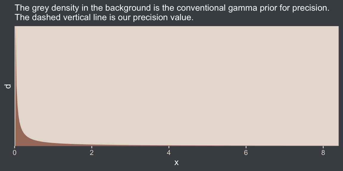 Not much for us, here. But we might reiterate that sometimes we talk about the precision (see page 453), which is the reciprocal of the variance (i.e., \(\frac{1}{\sigma^2}\)). As we’ll see, the brms package doesn’t use priors parameterized in terms of precision. But JAGS does, which means we’ll need to be able to translate Kruschke’s precision-laden JAGS code into \(\sigma\)-oriented brms code in many of the remaining chapters. Proceed with caution.