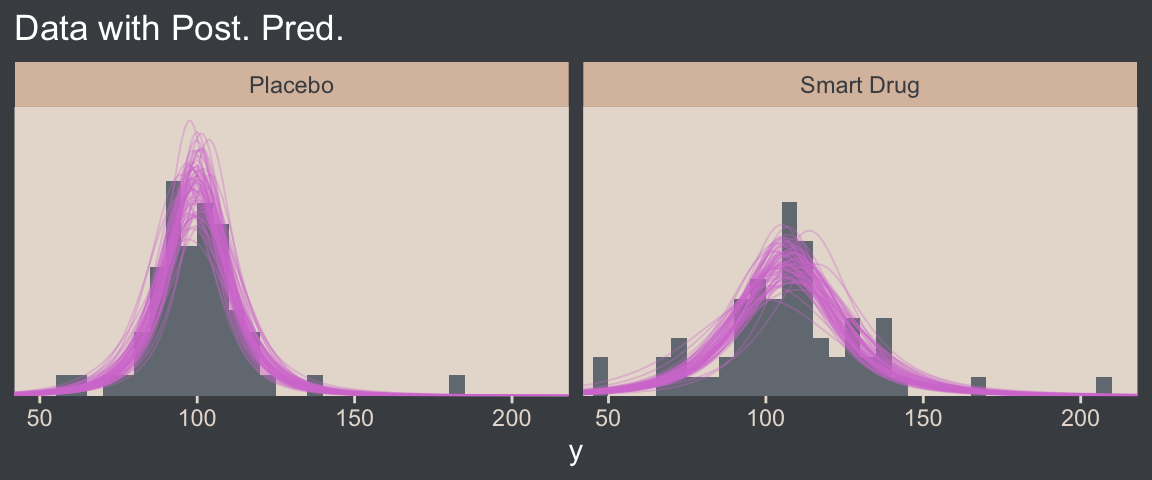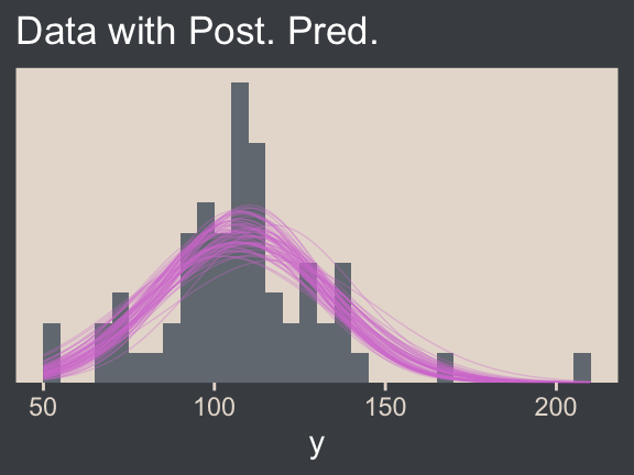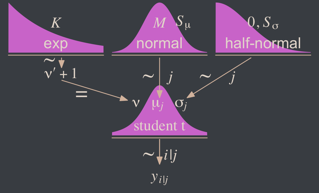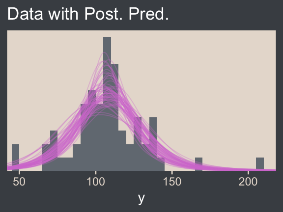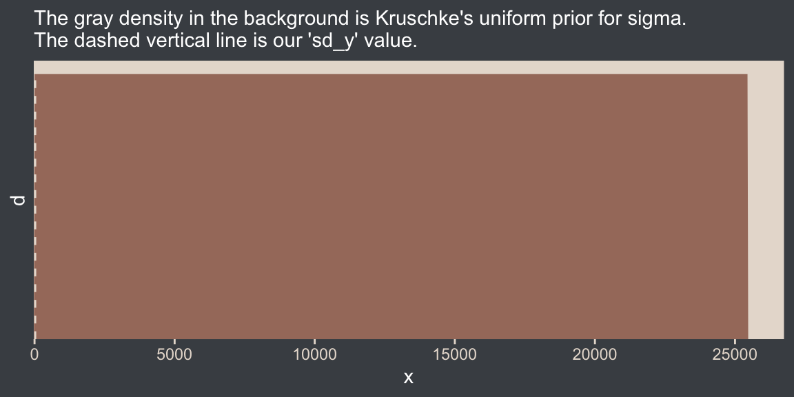 Although I agree this chapter covers the “most trivial cases of the linear core of the GLM”, Kruschke’s underselling himself a bit, here. In addition to “trivial” Gaussian models, Kruschke went well beyond and introduced robust Student’s \(t\) modeling. It’s a testament to Kruschke’s rigorous approach that he did so so early in the text. IMO, we could use more robust Student’s \(t\) models in the social sciences. So heed well, friends.