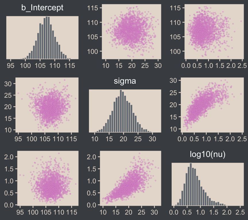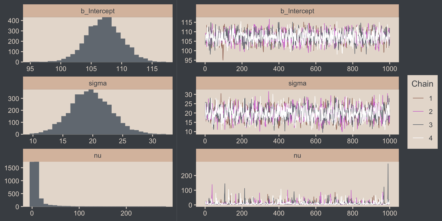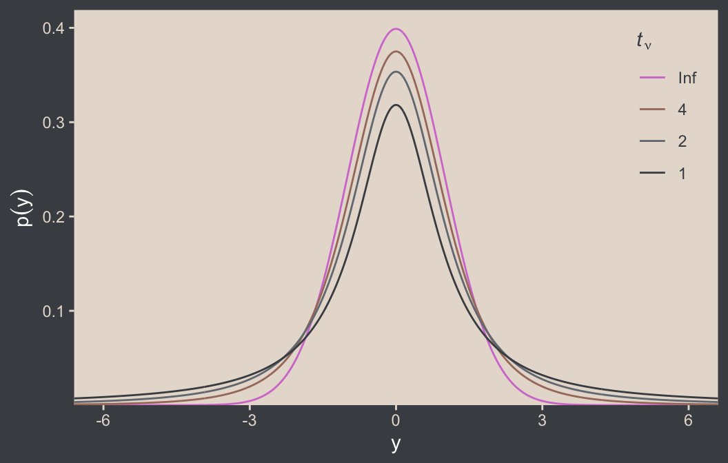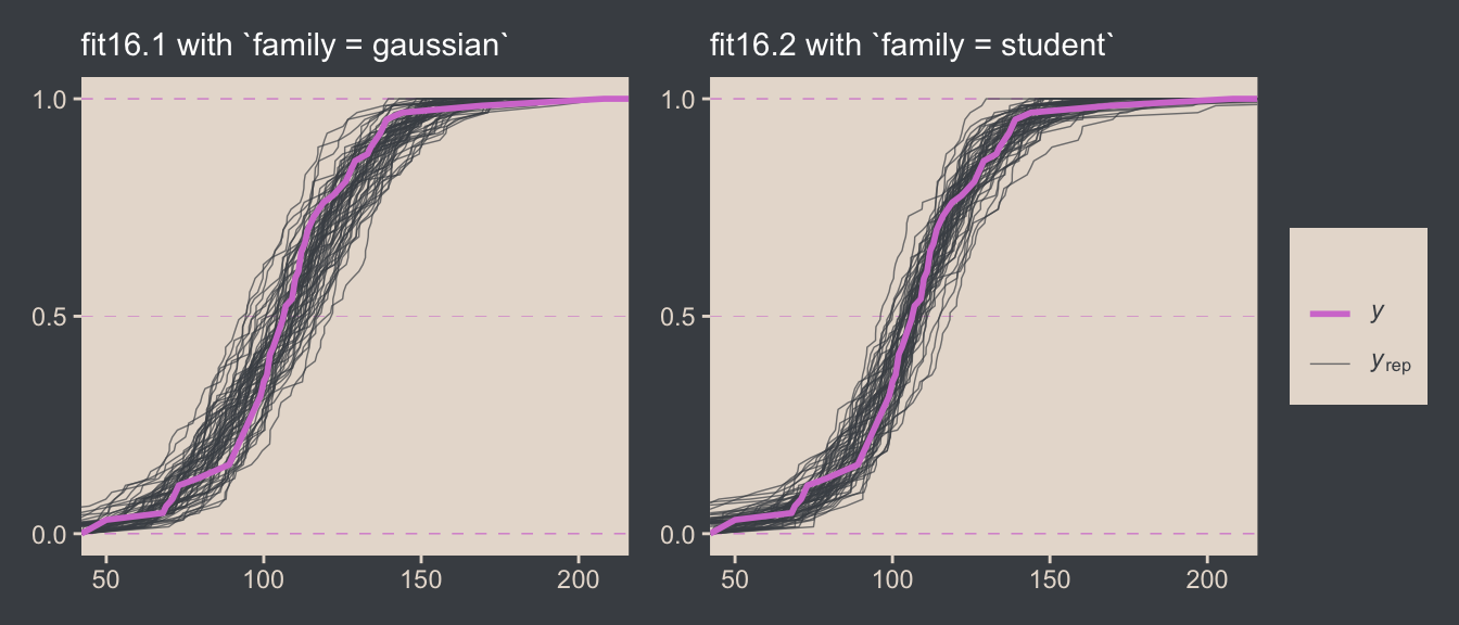 We’ll have more practice with the robust Student’s \(t\) in some of the following chapters. But if you’d like even more, you might check out my blog post on the topic, Robust linear regression with Student’s \(t\)-distribution, and the companion post, Bayesian robust correlations with brms (and why you should love Student’s \(t\)).