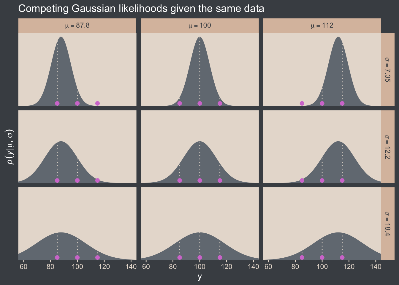 ggtitle("Competing Gaussian likelihoods given the same data") +